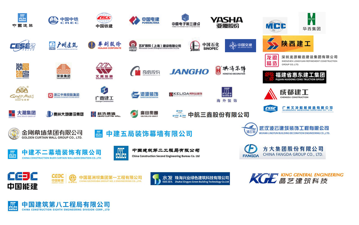 公司參建了諸多大型項目工程,如港珠澳大橋、珠海國際航展、深圳國際會展中心、廣州白云機場、西安全運會場館、成都東安湖大運會場館、樂山奧體中心、洛陽奧體中心、增城富士康廠房、惠州中海油、陽江核電站、珠三角各地鐵線、高鐵站、廣西桂林機場、廣西柳州文化廣場、四川成都天府機場、海南海口美蘭機場、西安絲路會展中心、惠州北站等等。與中國建筑、中國中鐵、中國鐵建、中國電建、中國交建、中國中冶、中國能建、廣東建筑、廣西建工、廣州建筑等大型國有企業(yè)下屬公司及江河幕墻、金螳螂裝飾等各大建筑裝飾、幕墻裝飾公司達成長期友好合作關系。