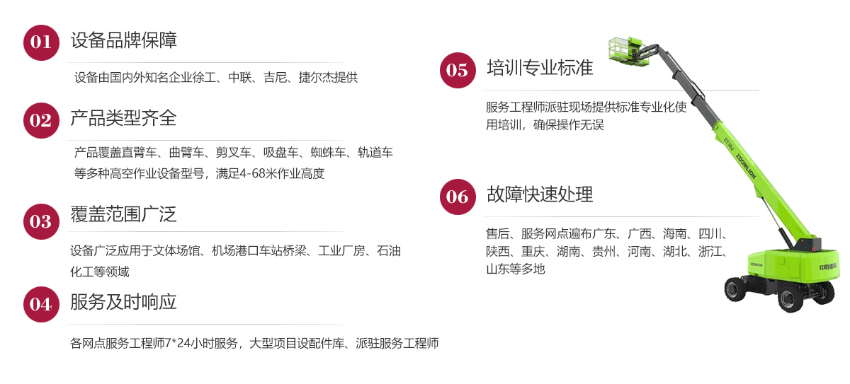 公司在發(fā)展歷程中堅定實行大客戶戰(zhàn)略,致力于以優(yōu)質的服務打造公司的品牌和核心競爭力,現已在廣東、廣西、海南、四川、陜西、湖南、重慶、河南、湖北、貴州等多地建立了完善的售后服務網點,24小時為客戶排憂解難。今后我們將結合市場需求,不斷創(chuàng)新業(yè)務模式、優(yōu)化設備結構、加強運營管理、擴大服務網點、提升服務水平,形成以設備租賃、銷售、二手設備交易等全方位一站式的全面服務體系,用高標準高質量的服務讓客戶在和公司合作的過程中實實在在感受到省心、省力、省錢的體驗,在客戶心目中樹立“家鋒”的品牌形象。